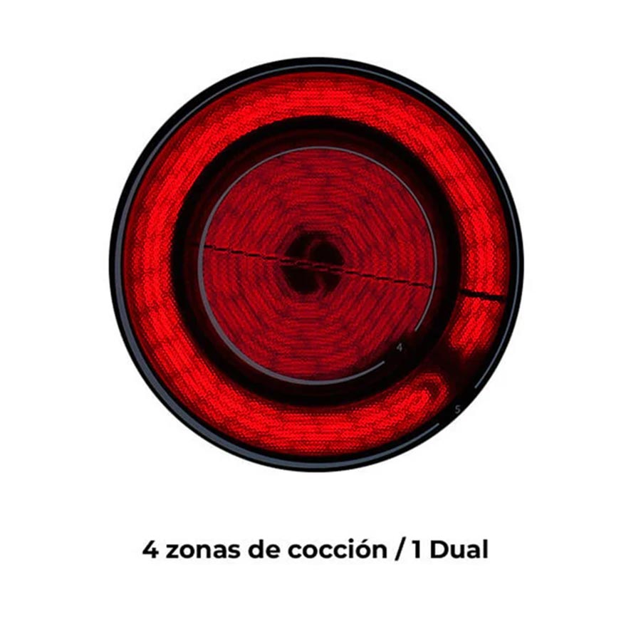 4 diferentes tamaños para un mejor aprovechamiento del calor transferido. Una de ellas es Dual: dos potencias en la misma zona para adecuar su tamaño según el utensilio de cocina.