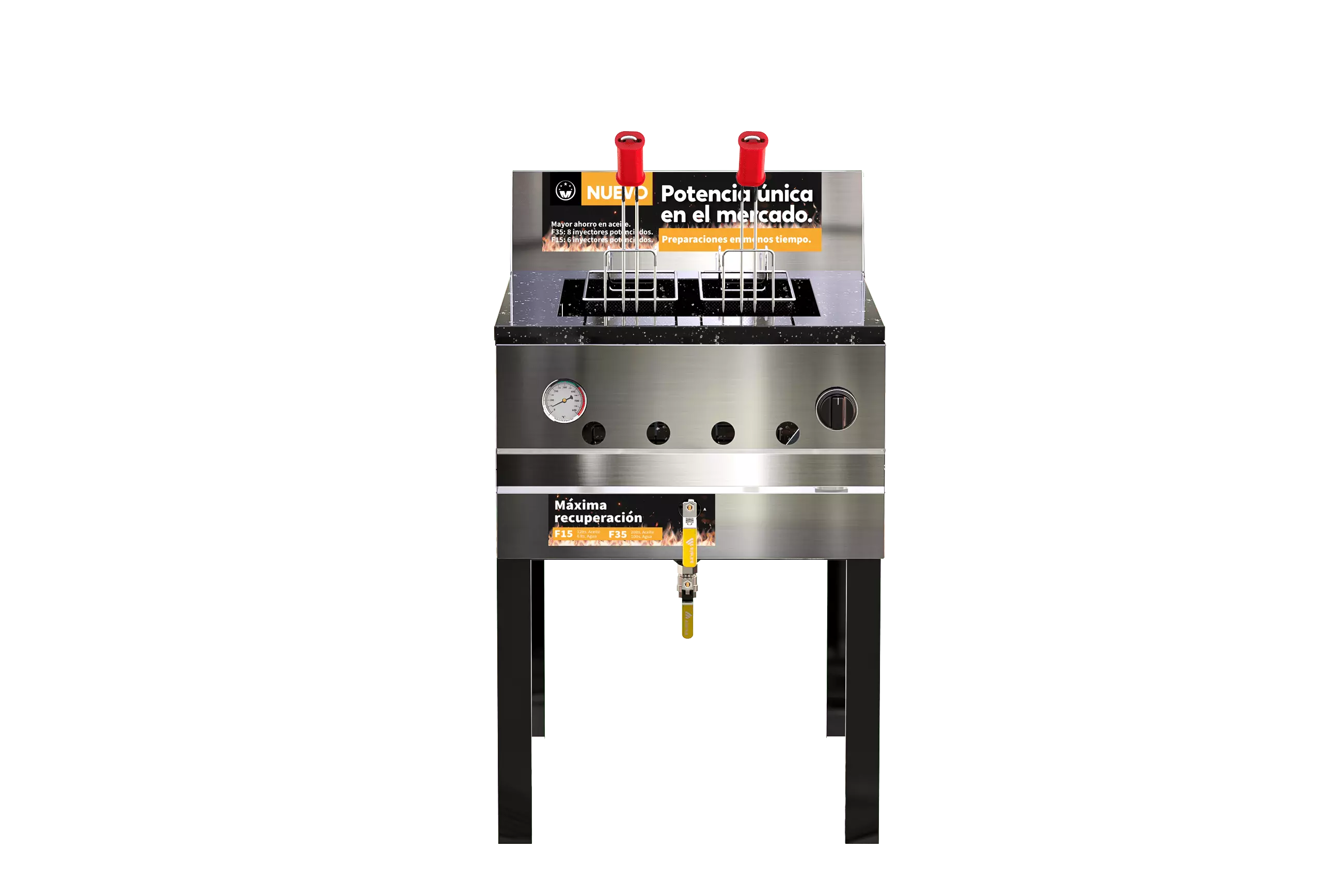 Los nuevos freidores potenciados de Morelli se presentan como el aliado perfecto para garantizar el éxito en cada preparación. Nuestra línea de productos incluye los modelos F15 y F35, diseñados con capacidades de 15 y 35 litros, respectivamente. Ambos freidores están equipados con características clave, como una válvula de seguridad y un sistema de máxima recuperación, que aseguran un funcionamiento confiable y eficiente en todo momento.