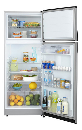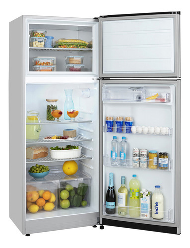 Heladera con freezer Cíclica. Eficiencia Energética A. Color Gris Aluminium. Gas ecológico R600a. Capacidad bruta 362 litros. Capacidad neta 359 litros. Deshielo manual. Dispenser de 2 litros de capacidad. Estantes regulables en altura en freezer y refrigerador. Anaqueles en contrapuerta para botellas y alimentos regulables en altura. Doble cajón para frutas y verduras. Cubeteras. Huevera. Apertura de puerta controlada. Control de temperatura interior. Luz interior LED. Origen Argentina.