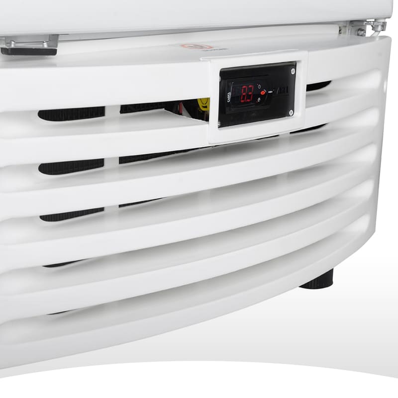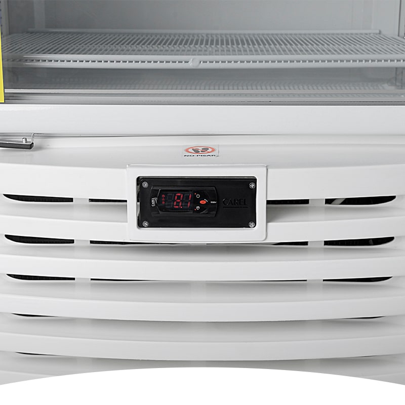 Exhibidora Vertical de Baja Temperatura – Sin Cenefa, Condensación y Evaporación Forzada, Controlador Inteligente con Indicador de Temperatura, Cuatro Estantes Móviles, Zócalo y puerta en color blanco, Puerta con 3 paneles de vidrio calefaccionados. Gas refrigerante R290.Para productos congelados. No apta para helados.