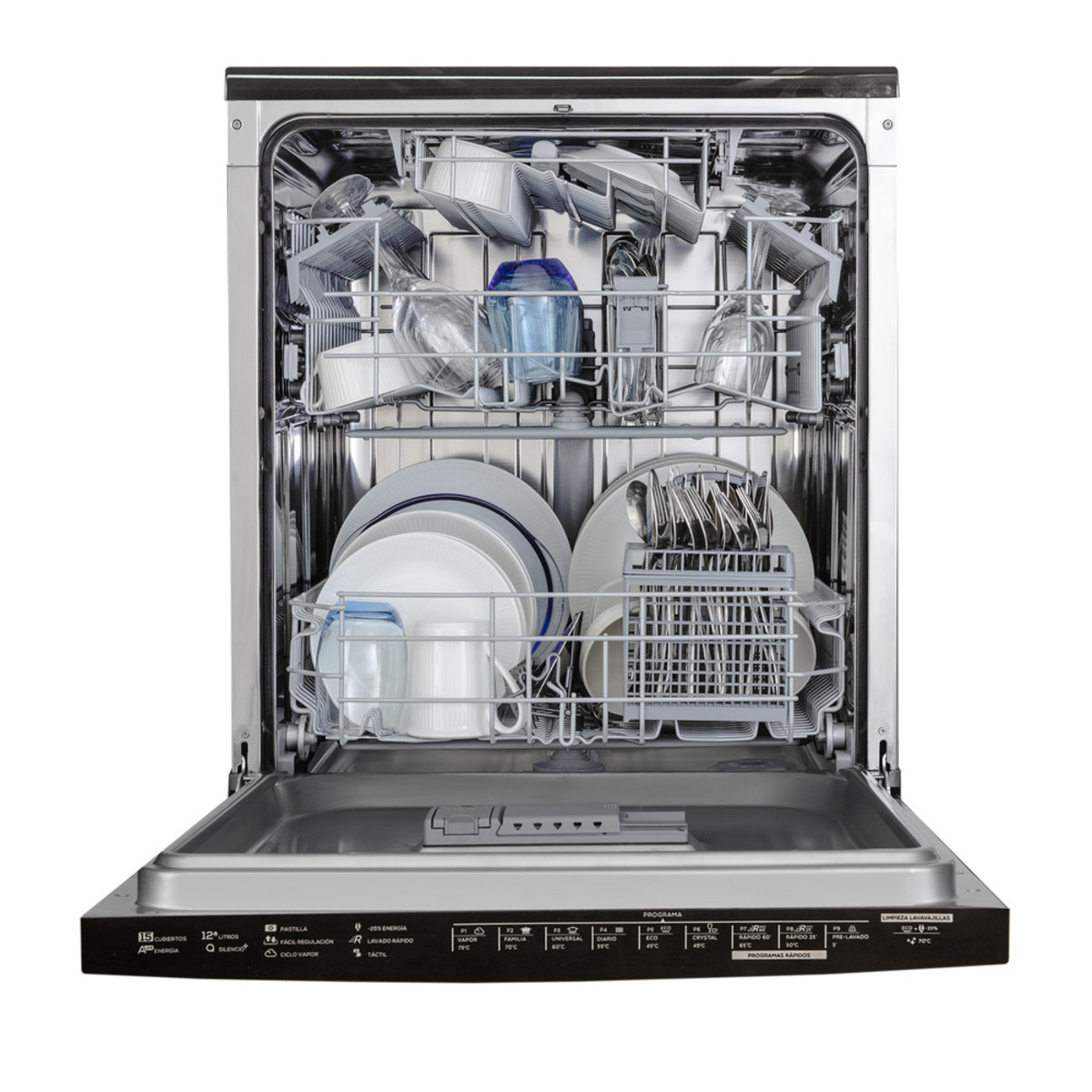 Lavavajillas con capacidad de lavado de 15 cubiertos. Color Negro. Eficiencia A+. Cuenta con 3 cestos separadores de vajilla y canasta para cubiertos. Panel táctil digital. Posee 9 programas de lavado: Universal, Eco, Prelavado, Vapor, Familia, Diario, Cristal, Rápido 60’, Rápido 25’. Tiene entrada de agua fría o caliente, lavando hasta un máximo de 75 grados. Función autolimpieza, inicio diferido y ahorro de energía. Indicador de falta de sal. Alarma fin de programa. Origen Argentina.